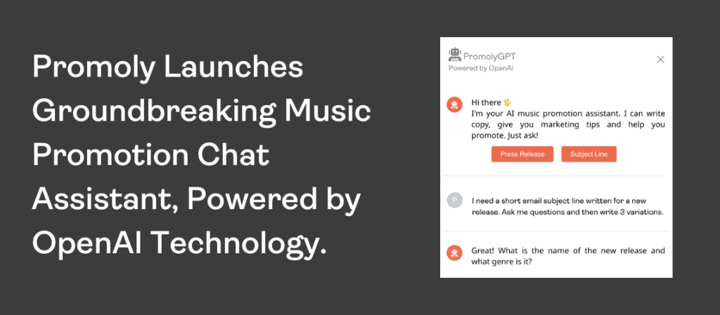“We’re excited to launch PromolyGPT and help record labels take their promotional efforts to the next level,” said Promoly Co-Founder Pete Callaghan. “Our chat assistant is easy to use, efficient, and highly effective, enabling record labels to create marketing campaigns that generate results.”